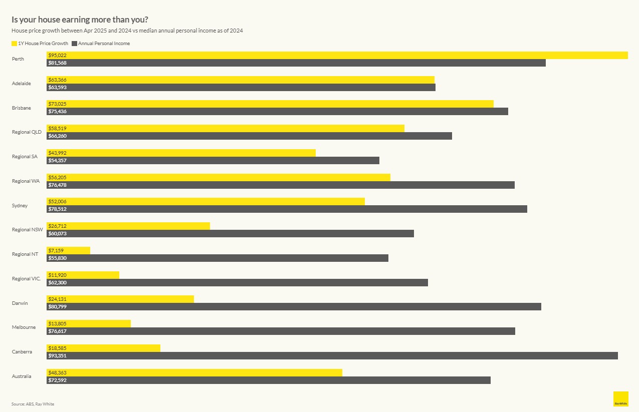 Between April 2024 and April 2025, Aussie house prices jumped from $871,671 to $918,296. Meanwhile, our median annual income sat at $72,592 – that’s 1.5 times more than the $46,625 our houses quietly made for us over the year.