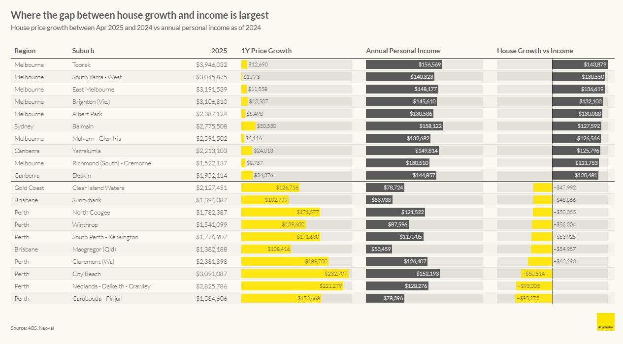 What’s especially telling is the range of house prices. Even among Perth’s strongest performers, house prices remain relatively accessible compared to Sydney and Melbourne. For example, Macgregor in Brisbane (where houses outperformed incomes) have house prices of just $1.38 million-less than half of Melbourne’s Toorak at $3.94 million.