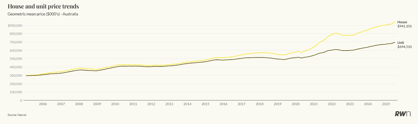 This acceleration appears to be directly driven by the Reserve Bank’s interest rate cutting cycle, with two cuts already delivered this year and three more anticipated before year’s end. If current monthly growth rates continue nationally, Australia could be looking at annual house price growth of around 12.7 per cent by mid-2026, nearly double the current 7.0 per cent annual rate, while unit growth could accelerate from 5.2 per cent to 7.4 per cent annually. Such acceleration would push the national median house price from $941,000 to over $1.06 million within 12 months, representing a $119,000 increase, while the unit median would rise from $695,000 to $746,000, an increase of around $52,000. With further rate cuts expected to provide additional stimulus, this coordinated acceleration phase may well strengthen further.