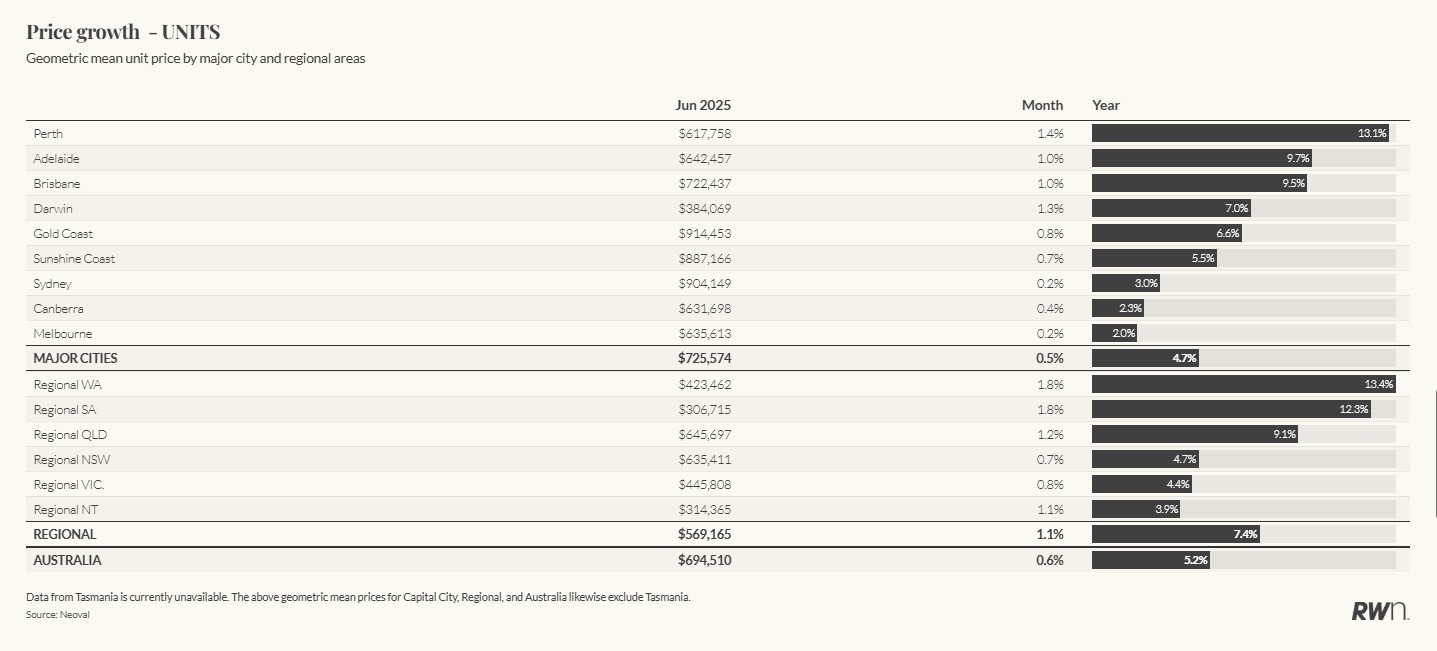 The unit market tells the same story, with Perth units leading the charge at 1.4 per cent monthly growth, significantly outpacing their 13.1 per cent annual rate, whilst Adelaide and Brisbane units both maintain solid 1.0 per cent monthly momentum. Even regional unit markets are participating in this synchronised surge, with Regional WA and Regional SA both recording exceptional 1.8 per cent monthly growth rates.