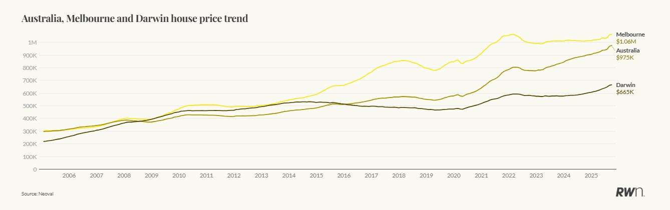 The broader trend data also reinforce how the two markets have diverged and converged over time. Melbourne remains well above its long-term trajectory, with a current median house price of around $1.06 million, while Darwin, at $665,000, is still below its 2014 peak but clearly regaining lost ground. The narrowing gap visible in long-run price trends shows how the national recovery is now spreading to the markets that were slowest to move.