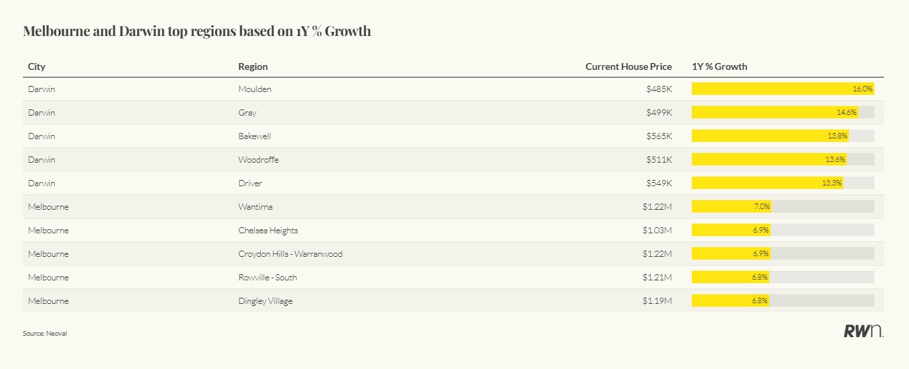 Melbourne and Darwin’s housing markets are finally heating up after sitting out the boom, with Darwin prices jumping 11 per cent and Melbourne hitting a new all-time high.