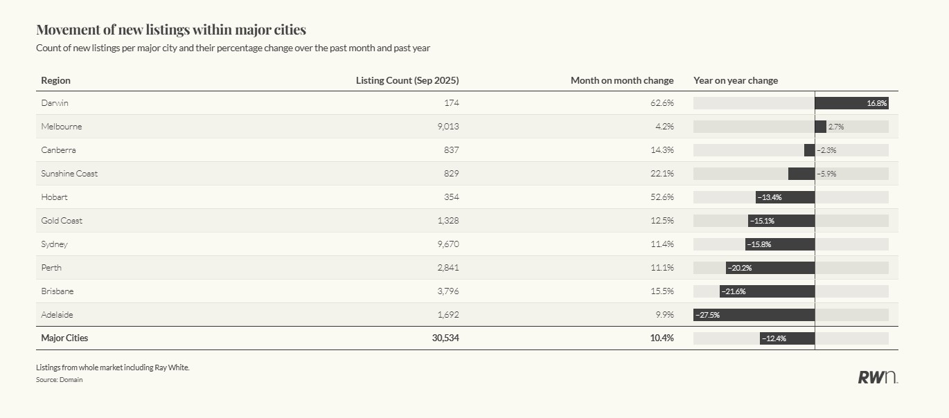 The lift in new listings confirms that sentiment is improving. Listings data across all agencies show Darwin listings up 62.6 per cent month-on-month and 16.8 per cent year-on-year, while Melbourne listings rose 4.2 per cent over the month. Rising supply in strengthening markets typically signals confidence rather than weakness, as vendors take advantage of firmer prices and faster sales.