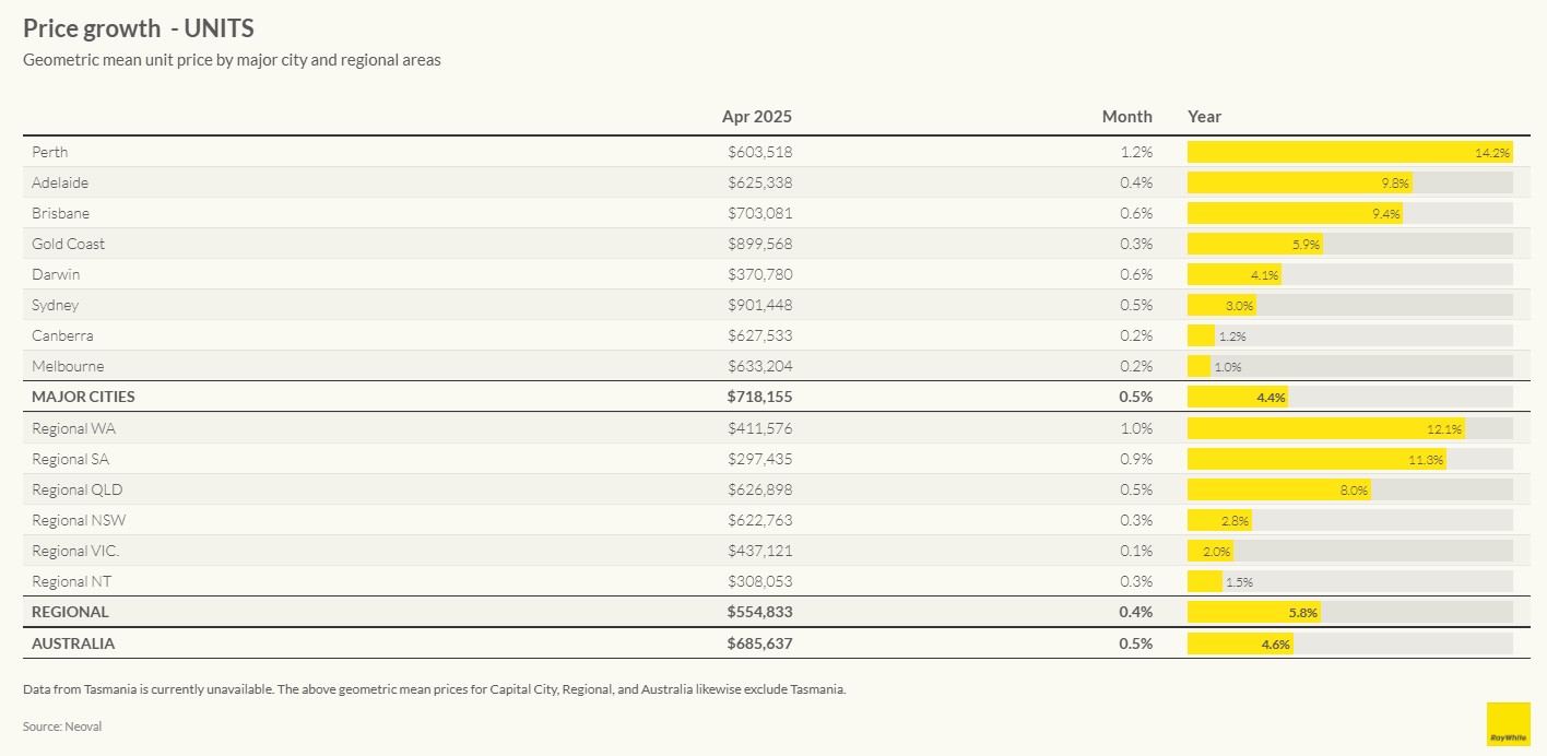 Perth continues its extraordinary run as Australia’s standout performer, with house prices rising 0.9 per cent in April alone, pushing annual growth to an impressive 12.2 per cent. Perth’s unit market is performing even more strongly, with 1.2 per cent monthly growth and a remarkable 14.2 per cent annual increase.