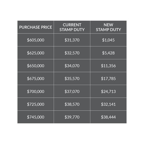 How does the concessional rate of duty work? The concession applies on a sliding scale. The closer the dutiable value is to $600,001, the greater the concession. However, if the purchase price is lower than $600,000 first-home buyers will be exempt from the stamp duty. See the table below for further info.