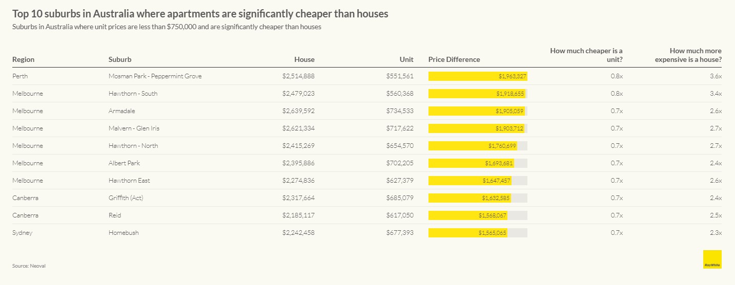 First home buyers priced out of premium suburbs by million-dollar house prices have a pathway to their dream postcodes. Analysis of suburbs offering the biggest price gaps between houses and apartments reveals opportunities for first-time purchasers to save up to $2 million by choosing units over houses in Australia’s most desirable locations.This analysis focuses specifically on areas delivering the greatest house-apartment price differentials with apartments in the chosen suburbs having a median under $750,000, generally considered within first home buyer budgets.
