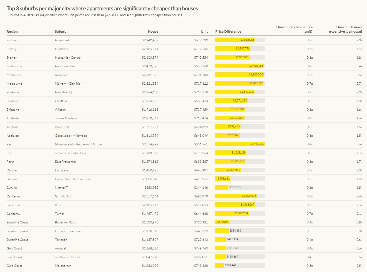 The results were then ranked by the absolute dollar difference between house and apartment geometric means, with the largest gaps indicating the greatest potential savings. This approach identified suburbs where first home buyers could access premium locations through apartment purchases while achieving maximum cost savings compared to house purchases in the same areas.