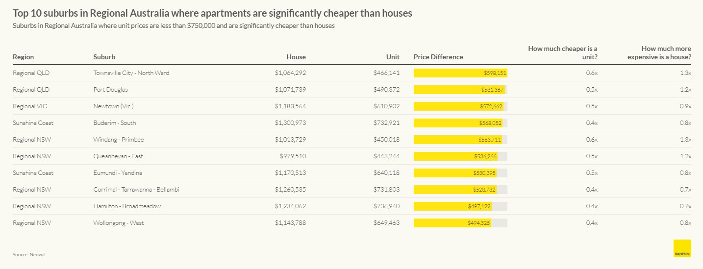 Queensland dominates regional opportunities, claiming six of the top ten positions. Townsville’s North Ward leads at $466,000, followed by Port Douglas at $490,000 – both delivering around $600,000 in savings while providing access to tropical lifestyle benefits typically associated with much higher price points.
