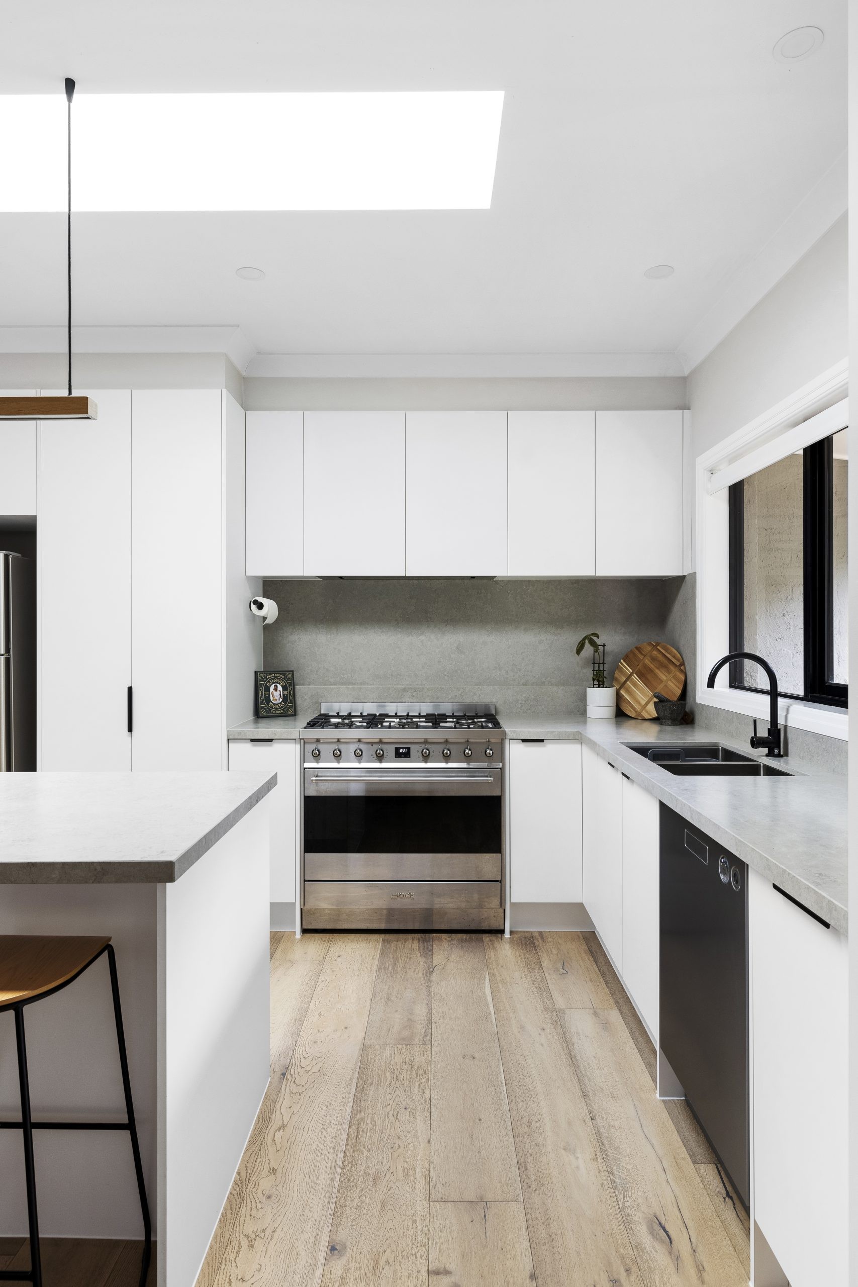 “Particularly in bigger, three-sided kitchens, timber all the way through can appear heavy. Break things up with a secondary colour to add depth and definition.”