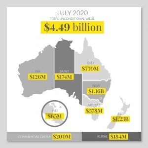 As a combined group we sold more than $4.49 billion in unconditional sales in July 2020, which was up 33 per cent on July 2019. Our New Zealand team posted its best month ever at $1.23 billion, a massive 52 per cent up on the same month last year. NSW/ACT ($1.16 billion), Commercial ($200 million) and Rural ($184 million) recorded their best July results.