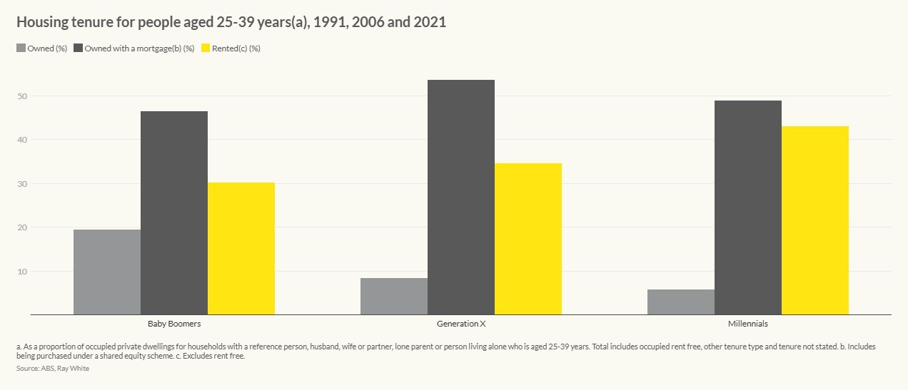 Only 55 per cent of millennials aged between 25-39 own their home, compared to 70 per cent of baby boomers at the same age in 1991 and 65 per cent of Gen X in 2006. This dramatic shift reflects more than just affordability challenges – it represents a fundamental change in how young Australians must approach homeownership.