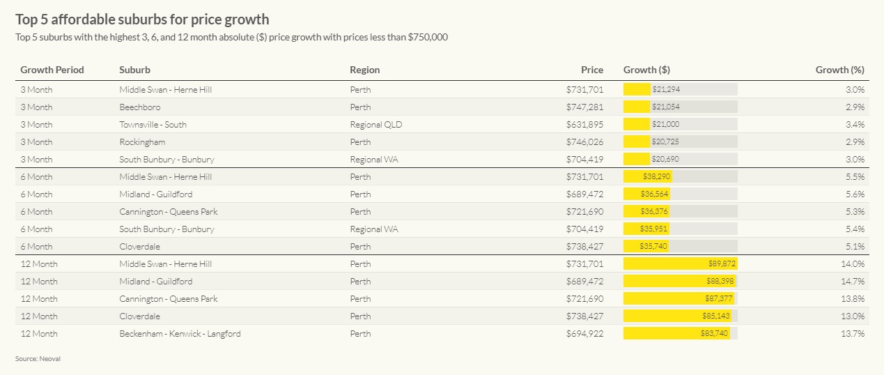 The data supports this approach, with Perth dominating the top-performing affordable suburbs for price growth. Areas like Middle Swan-Herne Hill have recorded impressive gains of over $20,000 in three months alone, representing a growth rate of 3 per cent. What’s particularly striking is that these growth suburbs maintain median prices below $750,000, making them accessible to first-time investors while still delivering substantial capital appreciation.